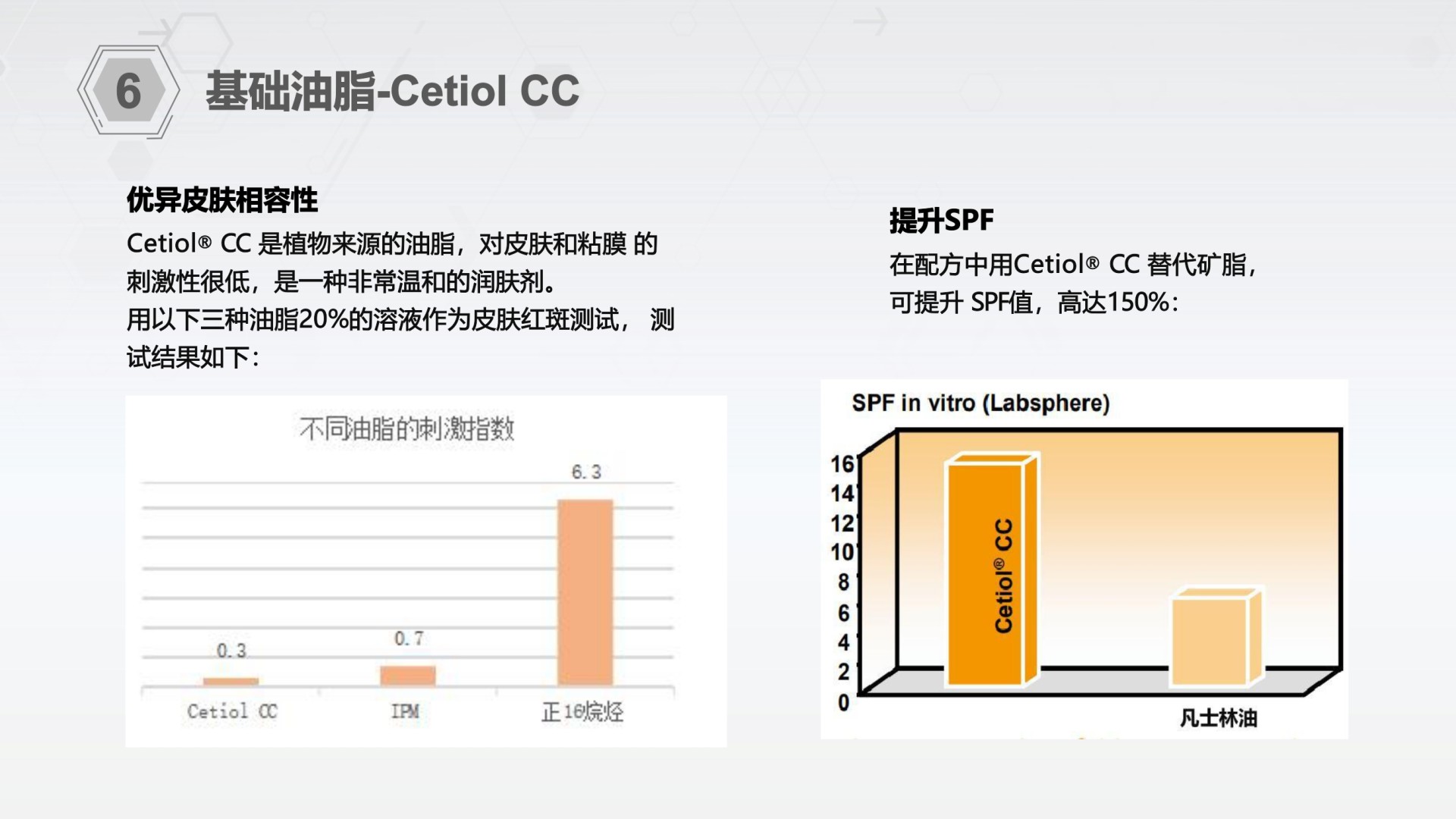 描述: Cetiol C 5C:拥有丝绒般柔滑的温和油脂, 可以替代植物油,其刺激性比水还低 Cetiol Sensoft:具有多维柔软感,高铺展性的油脂,对结晶型紫外线过滤剂具有出众的溶解性能,对效果颜料也具有出众的分散性能。非常适合用于防晒产品 Cetiol Ultimate:是一款天然来源,清新,干爽,具有挥发性的油脂,获得Ecocert & Cosmos & Nature认证,可以替代硅油的使用,避免了硅油的封闭作用可能对皮肤引起的过敏反应。同时降低防晒剂的油腻感 |