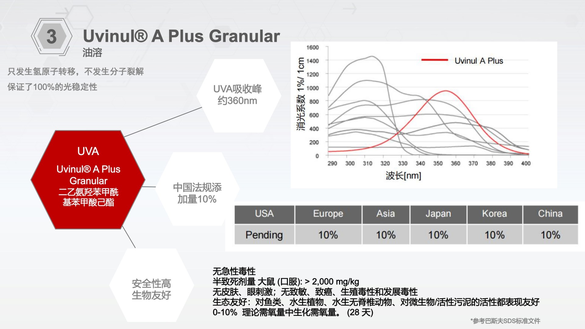 描述: Uvinul MC 80:目前世界范围内最广泛使用的UVB防晒剂,对皮肤的刺激性小 Uvinul T-150:最高效、光稳定的 UVB 过滤 剂,其对防晒指数具有卓越的增效作用,每增加 1% Uvinul T 150至少能提升 SPF 值为7 Uvinul A Plus Granular:极具光稳定的UVA防护,杰出的溶解性能,与其它紫外线过滤剂和化妆品成分有良好的配伍性 |
